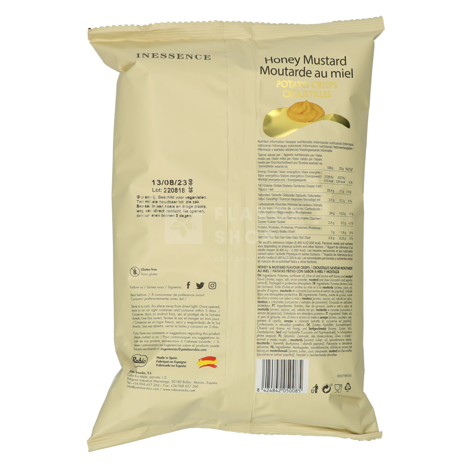 Zutaten: Kartoffeln, Sonnenblumenöl, Olivenöl und Honig-SENF-Geschmack (Aroma, Zucker, Salz, Zwiebeln). Pulver, SENF und Farbstoffe (Curcumin und Paprikaextrakt).