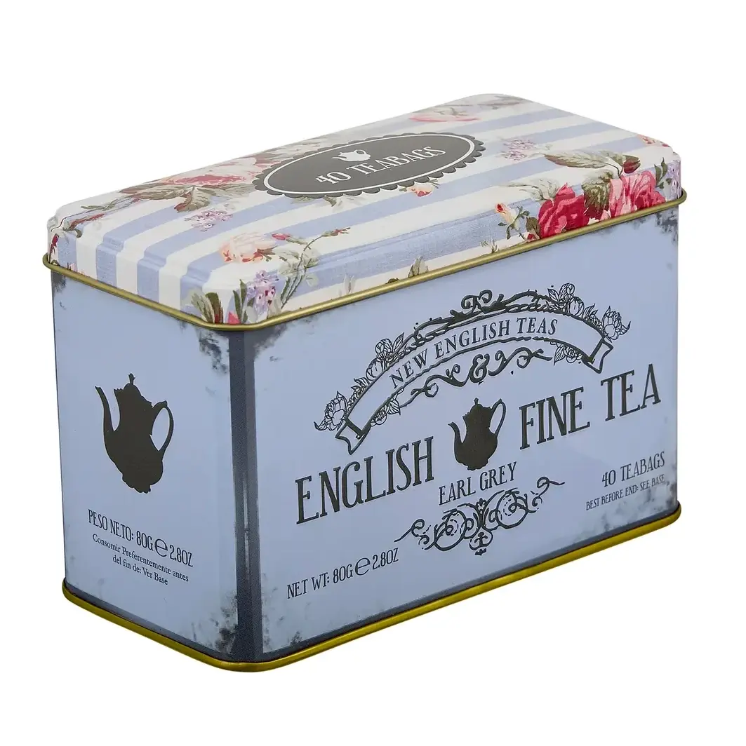 Luxuriöse Vintage-Dose mit 40 Earl-Grey-Teebeuteln, verfeinert mit Bergamotte. Ideal als Geschenk oder für einen entspannten Teegenuss.