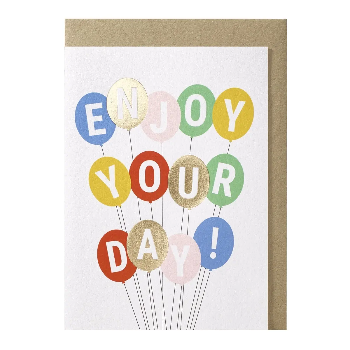 Fröhliche Ballonbuchstaben in leuchtenden Farben (einschließlich Akzenten aus Goldfolie) bilden zusammen die festliche Botschaft „GENIESSEN SIE IHREN TAG!“ Die Ballons schweben nach oben und machen diese Karte zu einer unbeschwerten, farbenfrohen Überraschung für jeden Moment, der es verdient, gefeiert zu werden.
