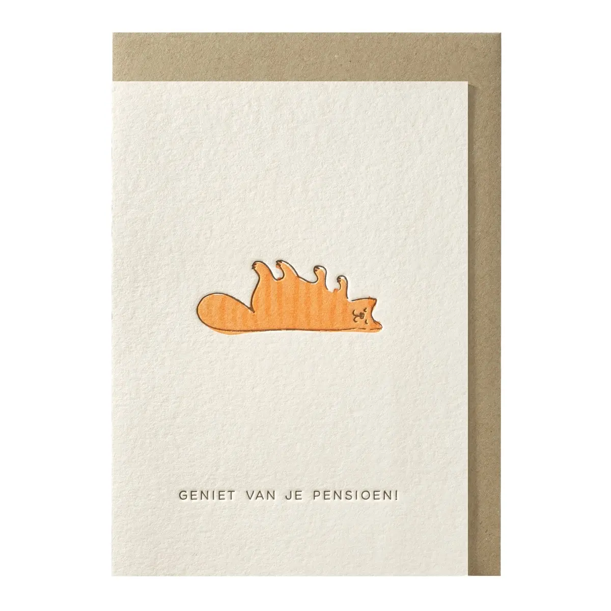 Auf der Vorderseite ist eine flauschige orangefarbene Katze zu sehen, die in einer bequemen Schlafposition ausgestreckt liegt – ein wenig gähnend, vielleicht sogar schnarchend. Der Text „Genießen Sie Ihren Ruhestand“ sagt alles: Vergessen Sie den Wecker, ab jetzt ist Zeit für Ruhe, Spaß und sich selbst.