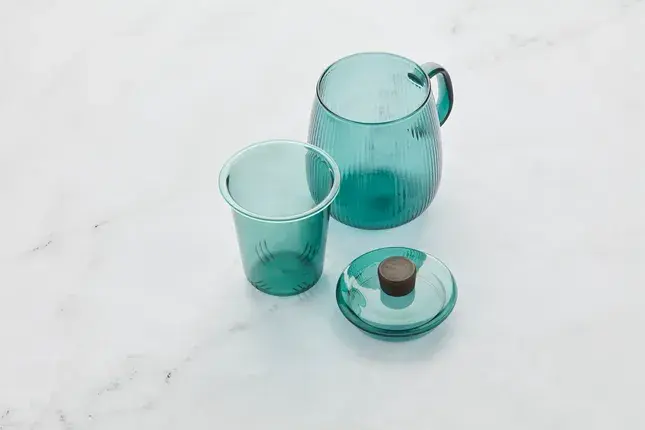 Die gerippte Oberfläche verleiht der Tasse ein elegantes Aussehen, während das transparente grüne Glas die Farbe Ihres Tees wunderschön zur Geltung bringt. Der integrierte Glasfilter ermöglicht die einfache Zubereitung von losem Tee, und der Deckel mit Holzknauf hält Ihren Tee länger warm und kann anschließend als Untersetzer für den Filter verwendet werden.