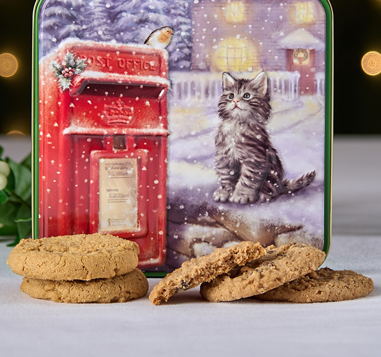 Diese wunderschön illustrierte und geprägte Dose zeigt ein neugieriges Kätzchen neben einem klassischen roten Briefkasten vor der Kulisse eines bezaubernden, schneebedeckten Dorfes. Die dezenten Prägungen erwecken die winterliche Szene zum Leben.