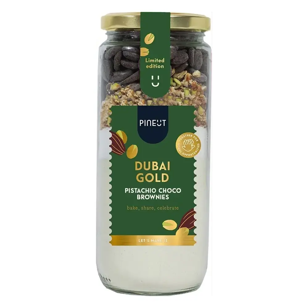 Mit dem Pineut Dubai Gold Brownie Mix backen Sie Brownies, die so besonders schmecken, wie sie klingen. Diese Mischung nimmt Sie mit auf eine kulinarische Reise: Der tiefe, reiche Geschmack dunkler Schokolade wird durch die warmen Noten von Kardamom und Zimt wunderbar ergänzt, während Pistazien für einen eleganten Crunch sorgen.