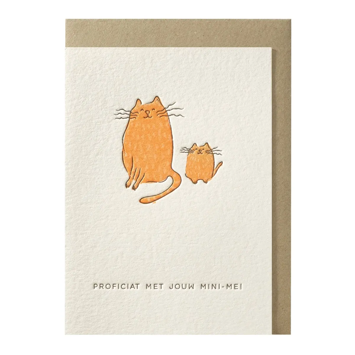 Zwei orangefarbene Katzen – eine große und eine kleine – sitzen strahlend nebeneinander. Die eine ist eindeutig die Mini-Version der anderen. Der Text „Herzlichen Glückwunsch zu deinem Mini-Me!“ macht diese Karte ideal für Geburten, Adoptionen oder einfach als süße Überraschung für frischgebackene Eltern.