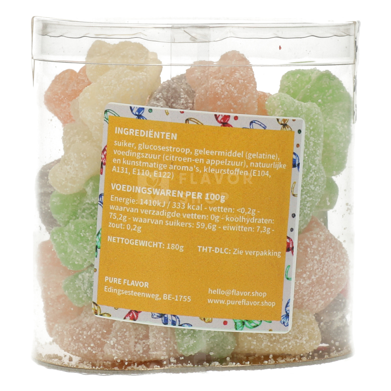 Zutaten: Zucker, Glukosesirup, Geliermittel (Gelatine), Speisesäure (Zitronensäure und Apfelsäure), natürliche und künstliche Aromen, Farbstoffe (E104, A131, E110, E122)