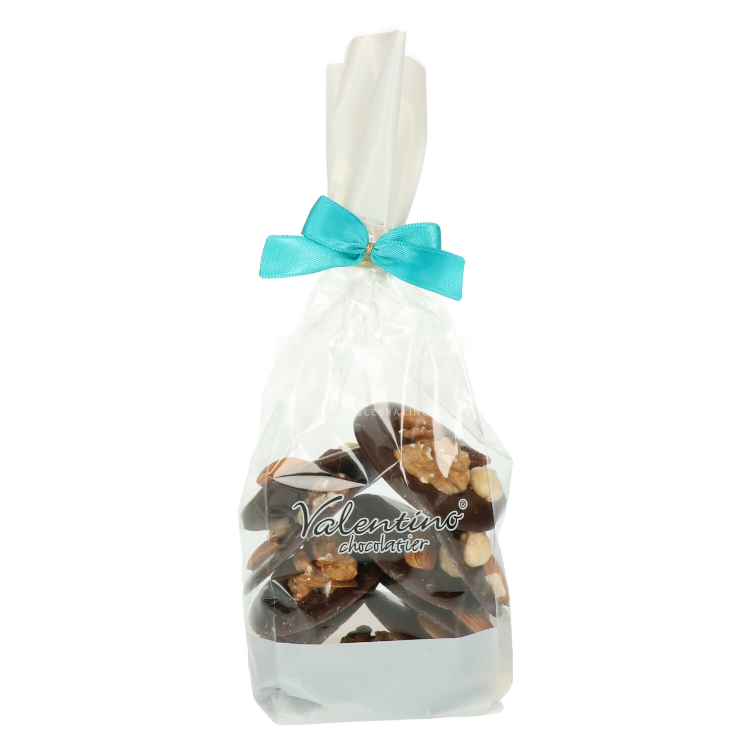 Belgische Fondantschokolade, eine Mischung aus Nüssen und Rosinen. Der perfekte Snack für zwischendurch! Diese Mendiants werden von den Valentino-Chocolatiers handgefertigt.