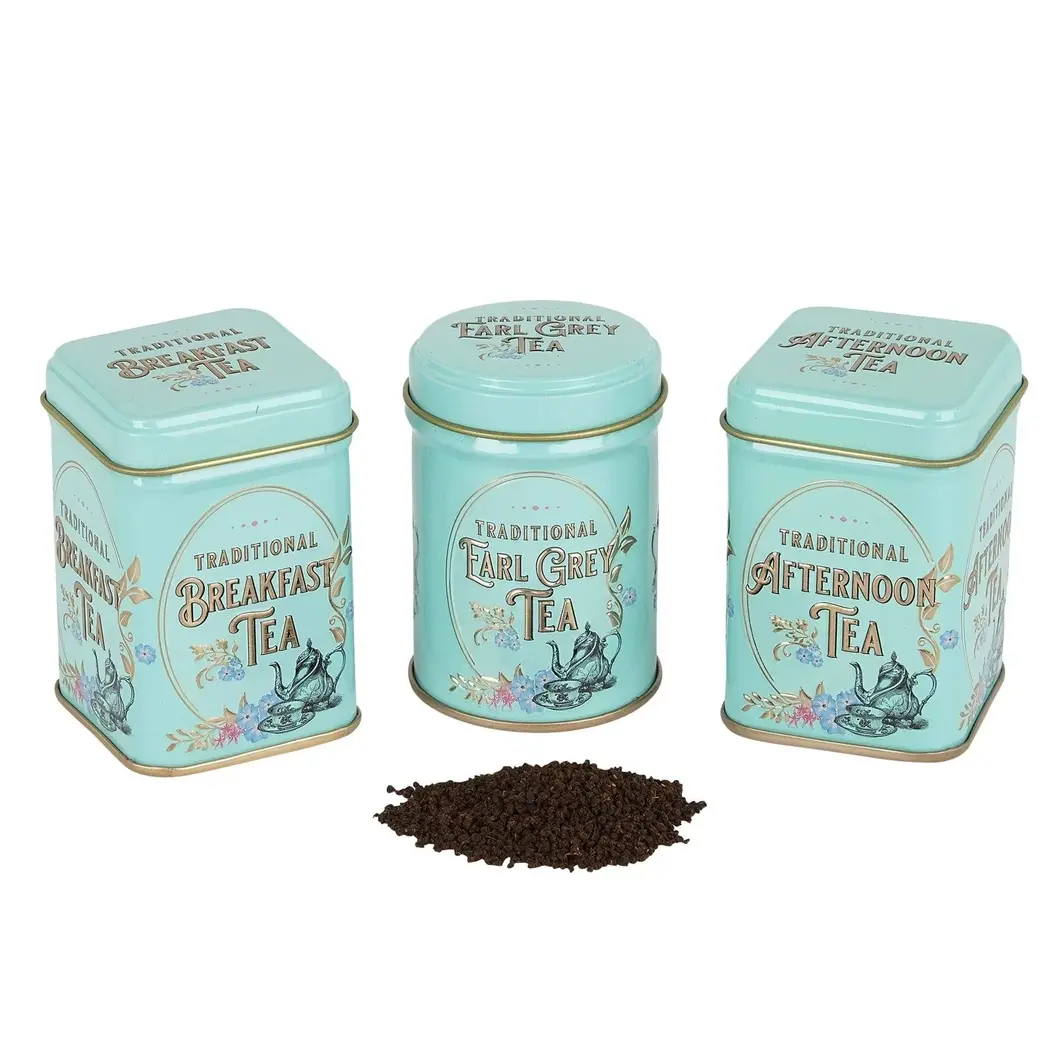 Charmante Geschenkbox mit drei Vintage-Teedosen, gefüllt mit losem Tee: English Breakfast, Afternoon Tea und Earl Grey. Perfekt für jeden Teeliebhaber.