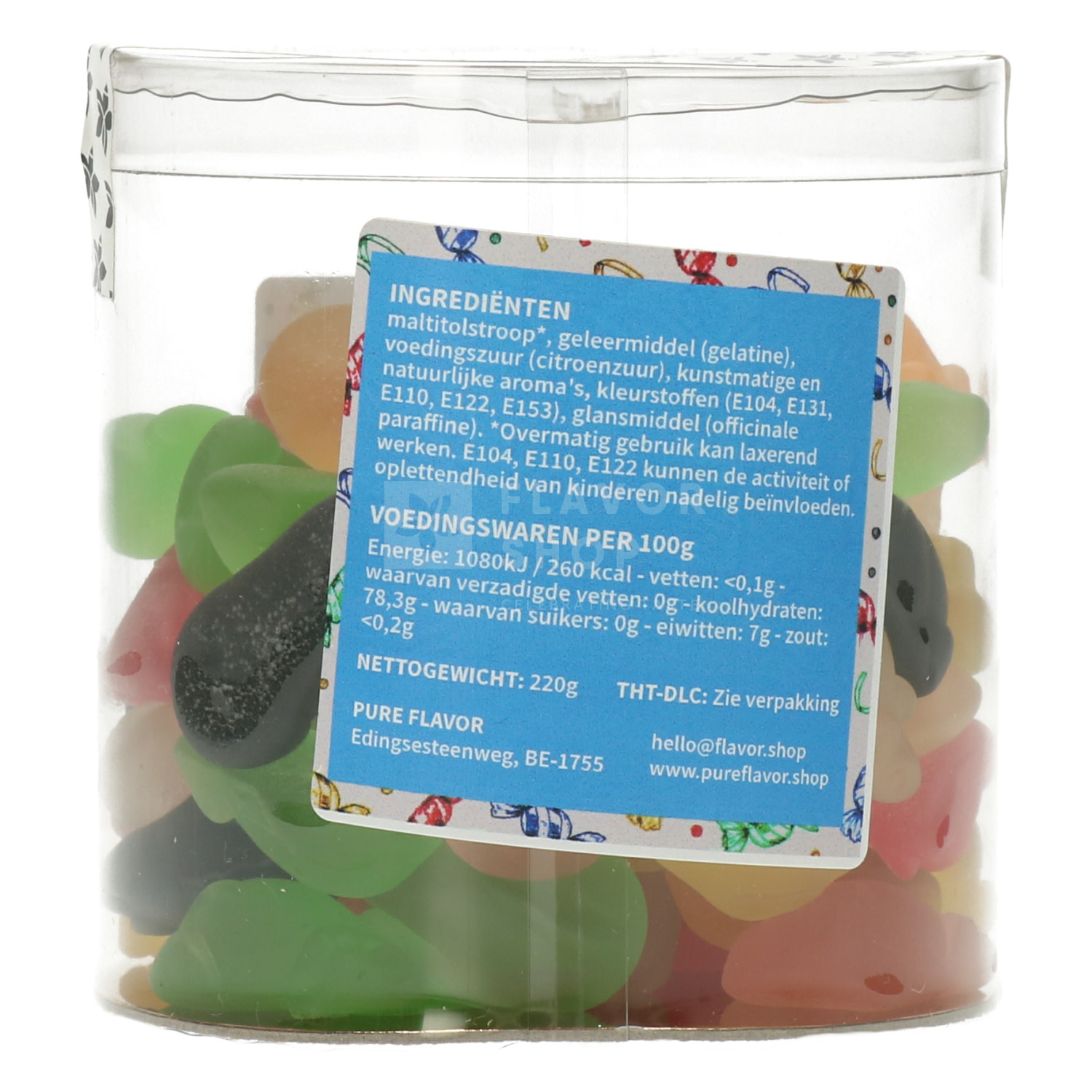 Maltitsirup*, Geliermittel (Gelatine). ), Lebensmittelsäure (Zitronensäure), künstliche und natürliche Aromen, Farbstoffe (E104, E131, E110, E122, E153), Überzugsmittel (offizielles Paraffin). *Übermäßiger Gebrauch kann eine abführende Wirkung haben. E104, E110, E122 können die Aktivität oder Aufmerksamkeit von Kindern beeinträchtigen.