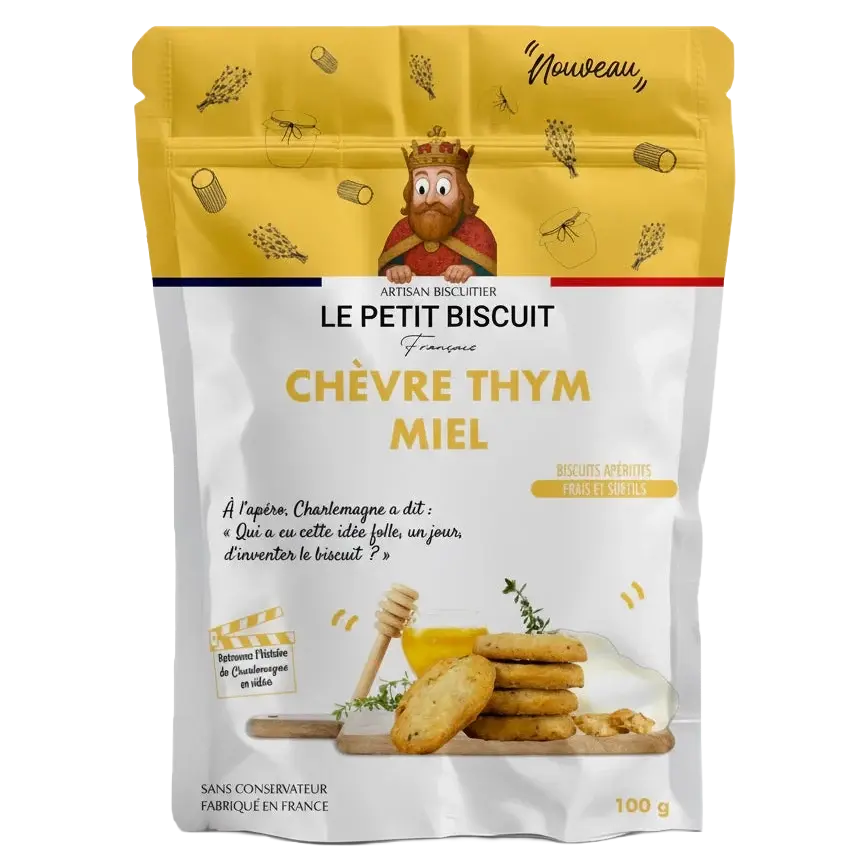 Le Petit Biscuit's Charlemagne biscuits are an ode to French gastronomy and the imperial character of their namesake. These crispy aperitif biscuits combine the creamy softness of French goat cheese with the fresh aroma of thyme and the subtle sweetness of honey. A harmonious taste experience that is both powerful and elegant.