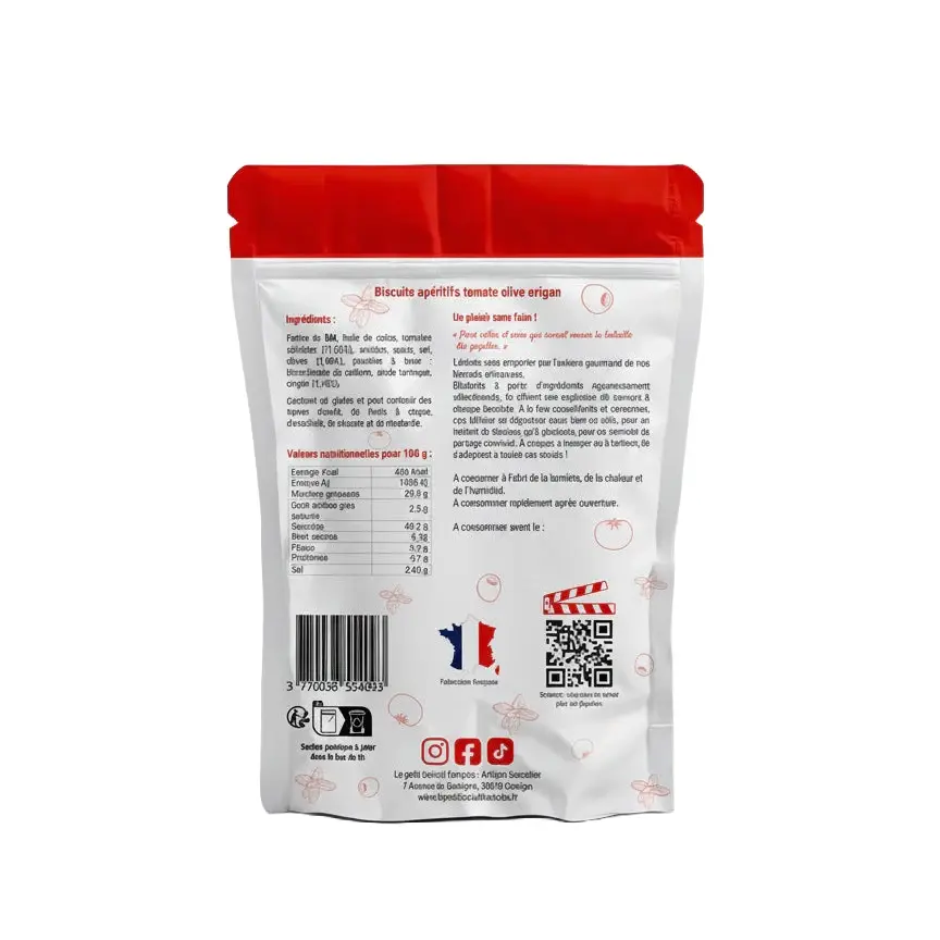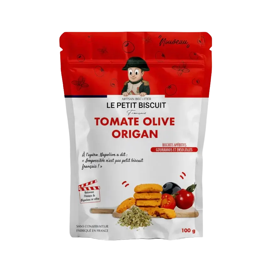 With Le Petit Biscuit's Napoleon line, you'll rediscover the taste of France with a generous dose of sunshine and character. These artisan-made aperitif biscuits combine the intense flavor of sun-dried tomatoes, tangy black olives, and aromatic oregano. Each bite is a mini explosion of Mediterranean flavors, wrapped in a deliciously crisp and slightly sandy biscuit.