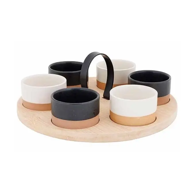 This round aperitif set consists of a sturdy serving board made of sustainable bamboo, topped with six ceramic bowls (Ø 6.5 cm x H 4 cm) in black and white with a natural, unglazed base. The bowls are perfect for serving dips, sauces, olives, nuts, or small tapas.