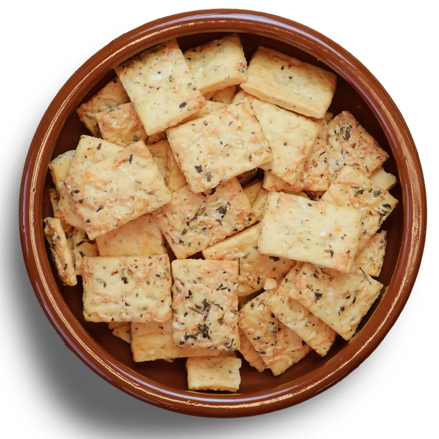 These Oregano Cheese Biscuits are crispy square biscuits, generously sprinkled with real cheese and fragrant oregano. The perfect balance of creamy cheese flavor and Mediterranean spice makes them irresistibly delicious. Ideal for lovers of savory snacks with character!