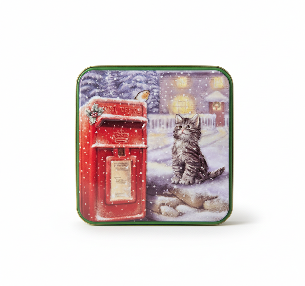 This beautifully illustrated and embossed tin depicts a curious kitten beside a classic red mailbox, against the backdrop of a charming, snow-covered village. The subtle embossed details bring the wintry scene to life.