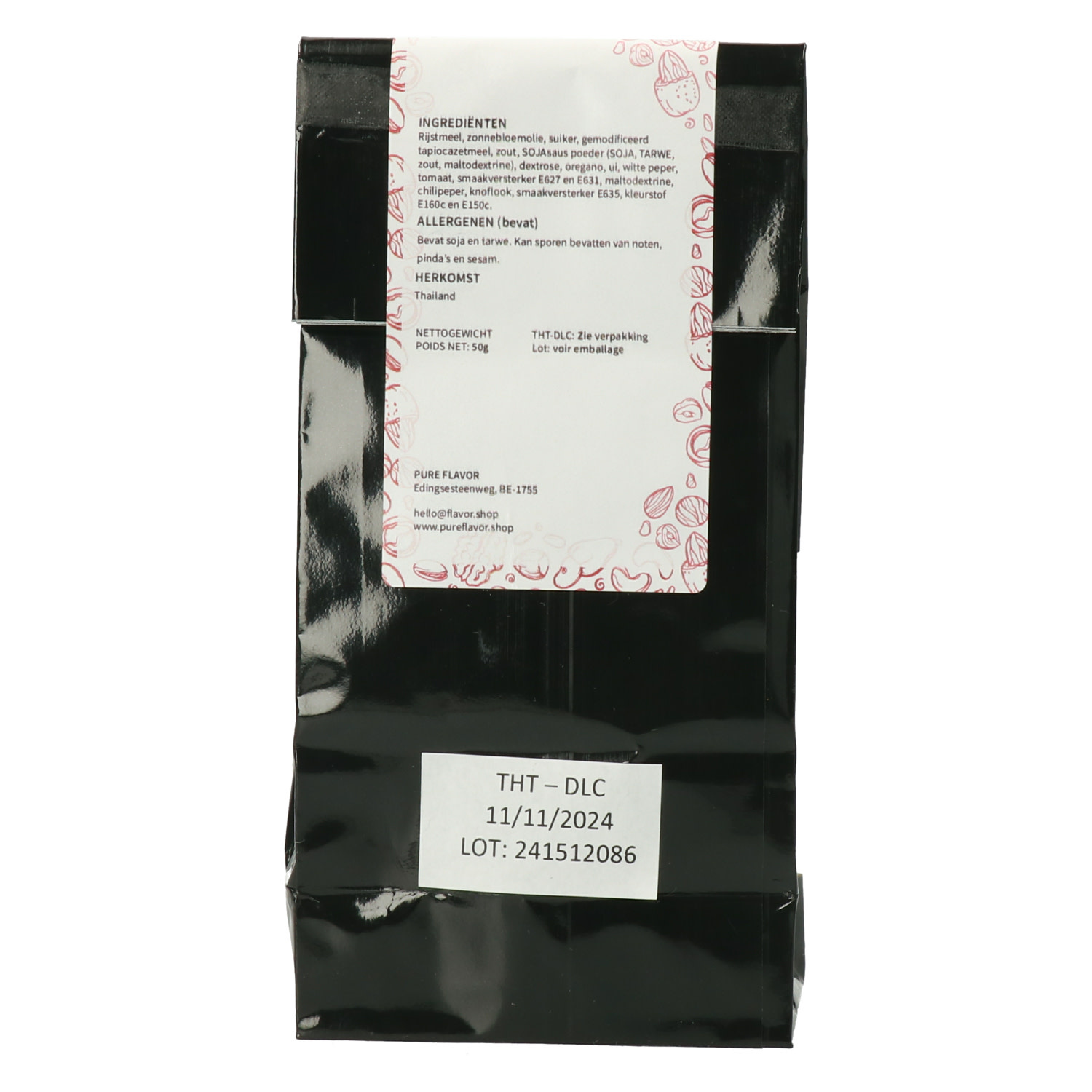 Ingredients: Rice flour, sunflower oil, sugar, modified tapioca starch, salt, SOY sauce powder (SOYA, WHEAT, salt, maltodextrin), dextrose, oregano, onion, white pepper, tomato, flavor enhancer E627 and E631, maltodextrin, chili pepper, garlic, flavor enhancer E635, dye E160c and E150c.