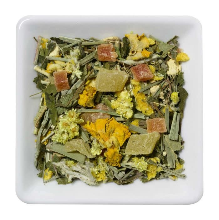 Pure Flavor Fit for the Day is a vibrant herbal infusion that provides a natural kick, without caffeine. Spicy ginger and refreshing lemongrass give you an instant boost, while orange slices and papaya add a soft, fruity sweetness. This harmonious blend is further enhanced with blackcurrant leaves, mullein flowers, and cat's paw blossoms, creating a colorful combination that tastes as good as it looks.