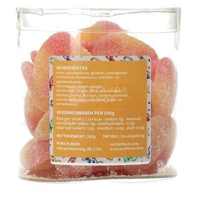 Ingredients: Sugar, glucose syrup, gelatin, food acid (citric acid, fumaric acid), fruit and plant extracts (orange, lemon, mango, passion fruit, aronia, grape, black currant, elderberry), flavouring, fructose, elderberry extract, invert sugar syrup, glazing agent (bee and carnauba wax).