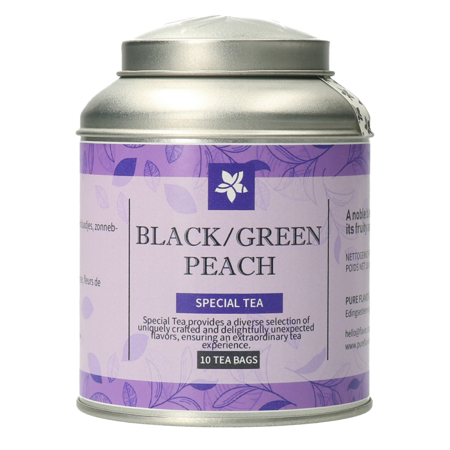 The Pure Flavor Black/Green Peach tea bags contain a carefully crafted blend of black and green tea, enhanced with rose petals, sunflower blossoms, and a hint of aromatic notes. This blend, presented in a stylish tin, is a true treasure for the senses. The combination of full, fruity, and sweet flavors, drawn from a rich and colorful fruit basket, creates a perfect harmony that will delight any tea lover.