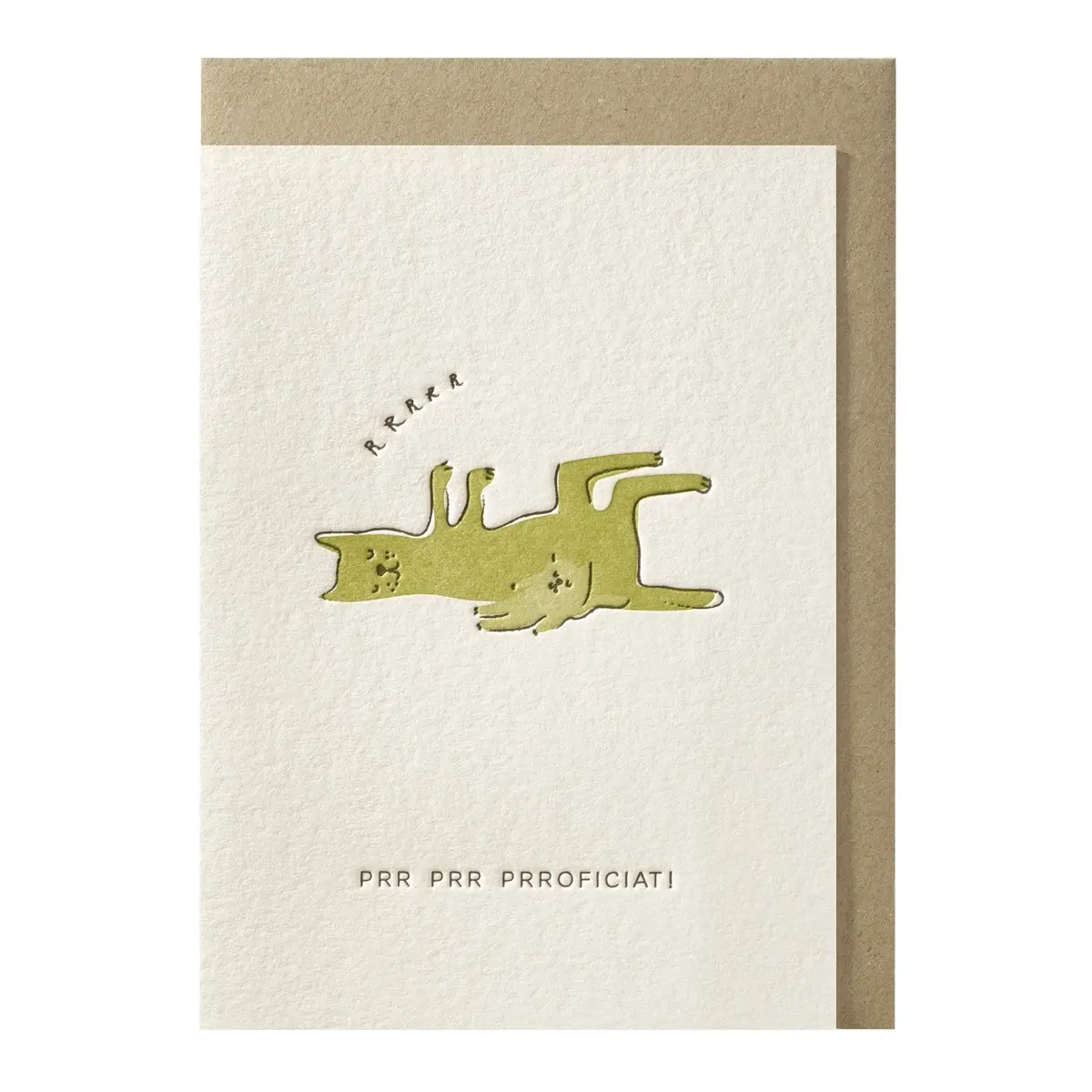 The front features a contented cat, lying on his back with paws in the air, purring with joy – Prrrr . The playful text “Prr Prr Prroficiat” makes this card the perfect way to congratulate someone on any milestone.