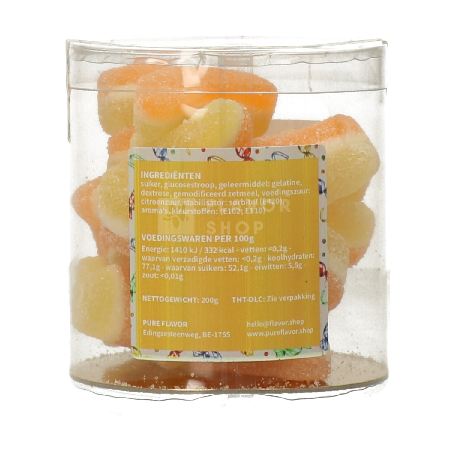 Ingredients: sugar, glucose syrup, gelling agent: gelatin, dextrose, modified starch, food acid: citric acid, stabilizer: sorbitol (E420), flavourings, colours: (E102; E110)