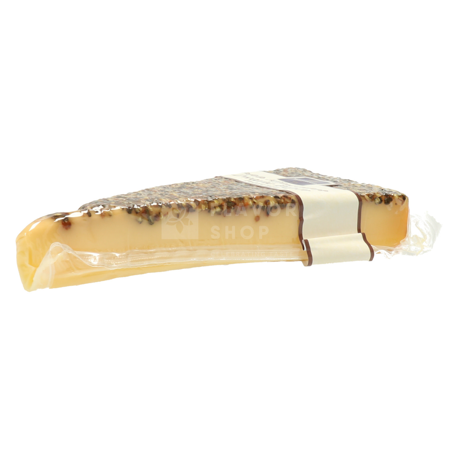 Après environ 16 semaines de maturation, le Wijngaard Affiné Zwarte Pepper est coupé et affiné avec des grains de poivre noir grossièrement concassés. Le goût doux-crémeux et beurré du fromage se marie à merveille avec le piquant du poivre.