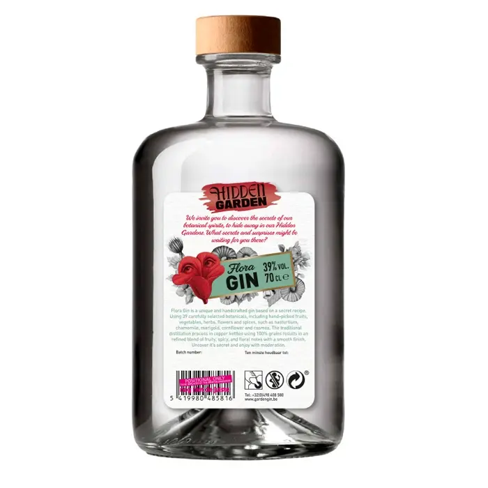 Le gin Hidden Garden Flora est un hommage à la nature dans sa forme la plus pure. Distillé en Belgique selon une recette secrète du maître jardinier Bart, ce gin artisanal contient un mélange unique de plantes soigneusement sélectionnées, telles que le genévrier, la capucine, la camomille, le souci, le bleuet et le cosmos.