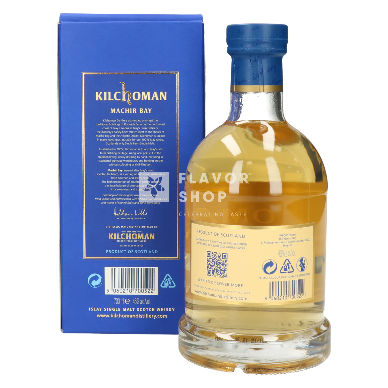 Nommée d'après la plage la plus spectaculaire d'Islay, Machir Bay est le fleuron de la chaîne Kilchoman. Machir Bay est une combinaison unique et complexe d'anciens fûts de bourbon et de fûts de sherry oloroso. Il y a principalement une influence ex-bourbon sur cette version qui est indiquée dans le tableau d'influence du fût présent sur le devant de la boîte.