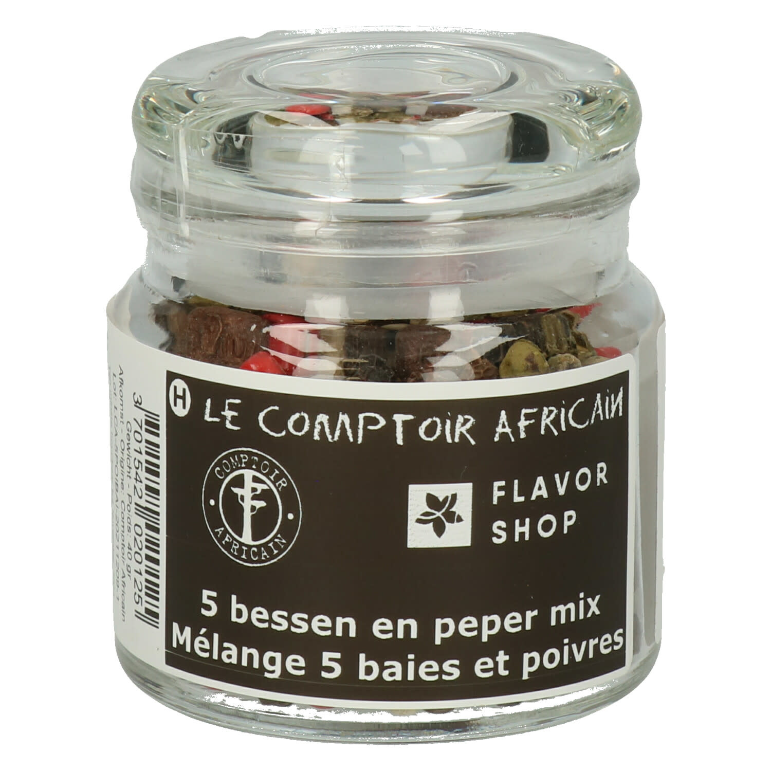 Délicieux mélange de poivre avec du poivre brésilien, du poivre blanc de Malabar, du poivre vert séché, du poivre de Jamaïque et des baies de poivre rose.