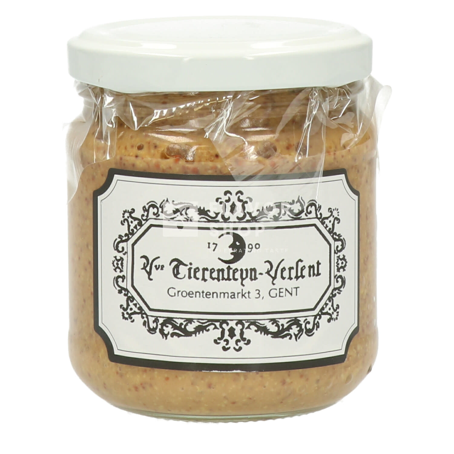 Variante de la célèbre moutarde Tierenteyn-Verlent. L'ajout de graines de moutarde entières donne une texture grossière, mais avec le même goût prononcé. Très savoureux dans les vinaigrettes, stoemp et stamppot!