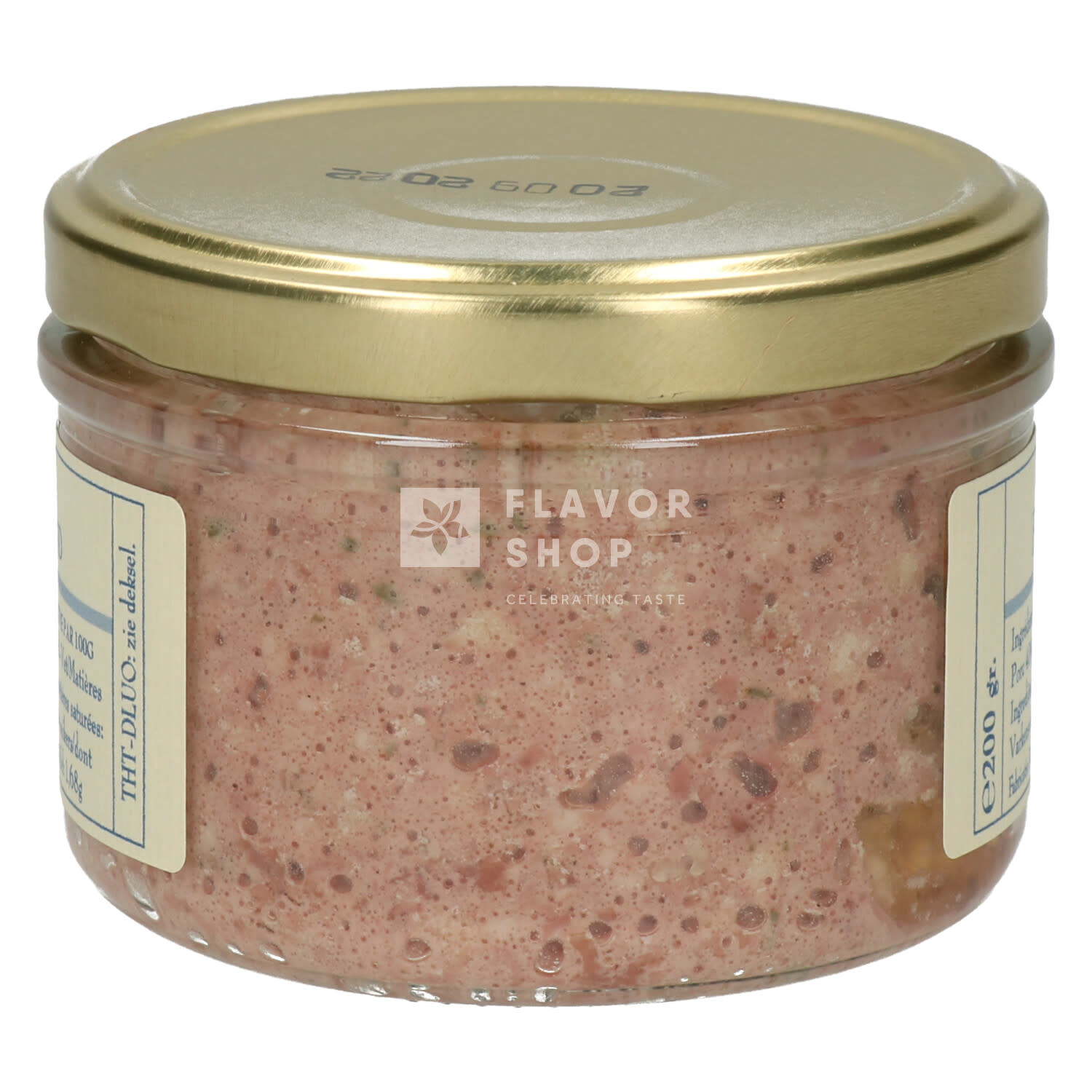 Viande de canard 40%, foie gras d'oie 10%, porc 40%, Cognac, épices, poivre, sel.
