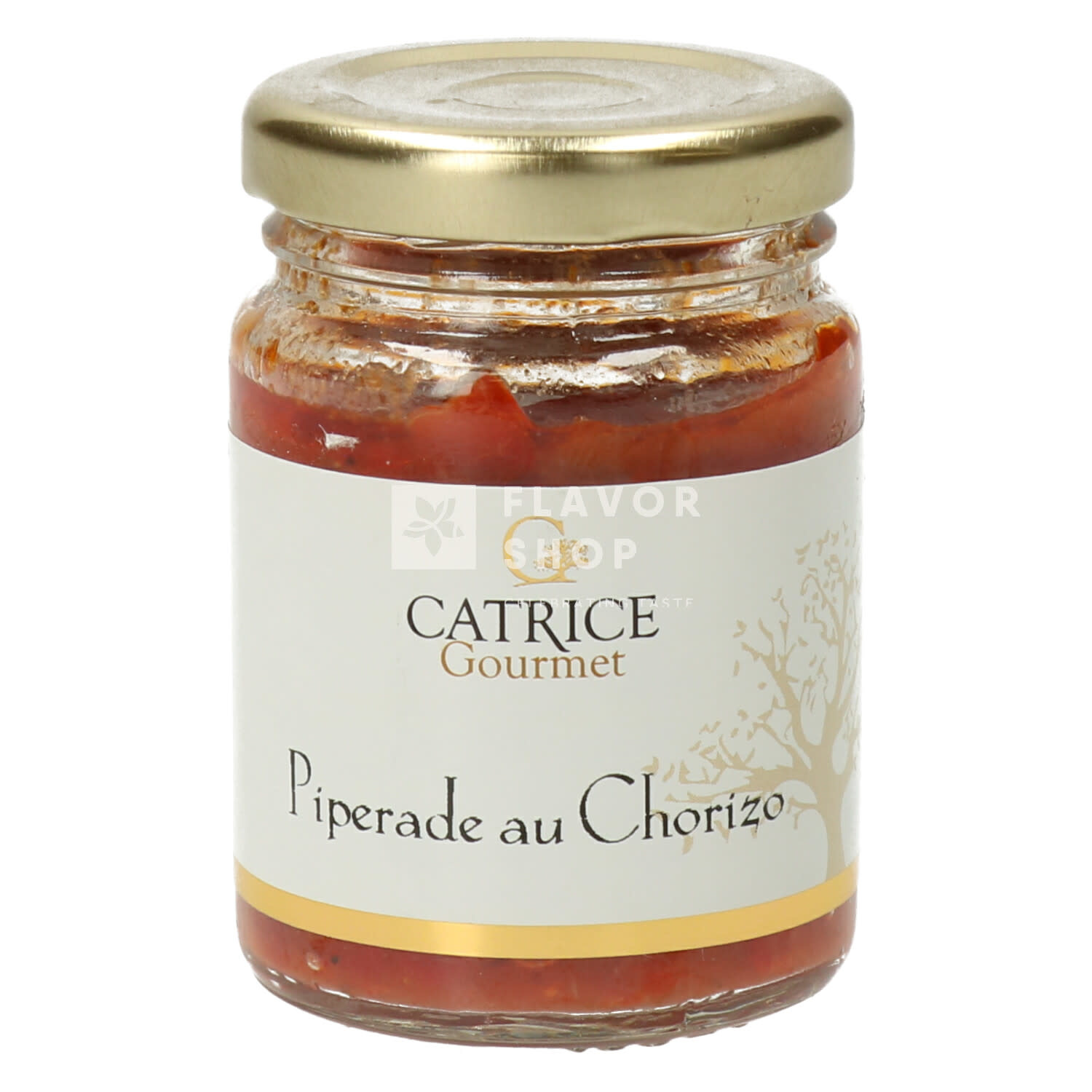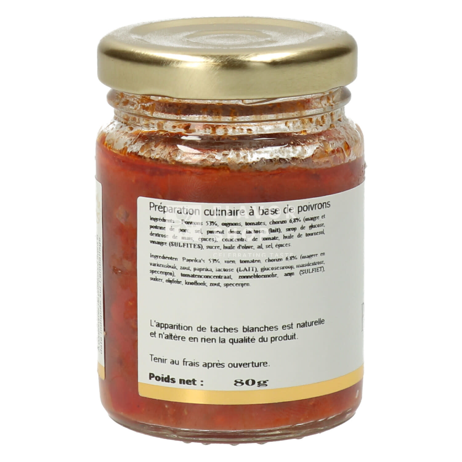 Instituants:Paprika 53%, oignons, tomates, chorizo 6,8% (porc et poitrine maigre, sel, paprika, lactose (lait), sirop de glucose, dextrose de maïs, épices), purée de tomates, huile de tournesol, vinaigre (SULFITEN ), sucre, huile d'olive, ail, sel, herbes."