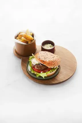 L'assiette et les bols sont en céramique résistante, compatibles lave-vaisselle, pratiques et faciles à nettoyer. Servez un hamburger parfaitement garni dans l'assiette, des frites dans le bol profond et la sauce dans le petit pot. La planche en acacia permet de tout ranger avec soin et apporte une touche d'élégance au service.