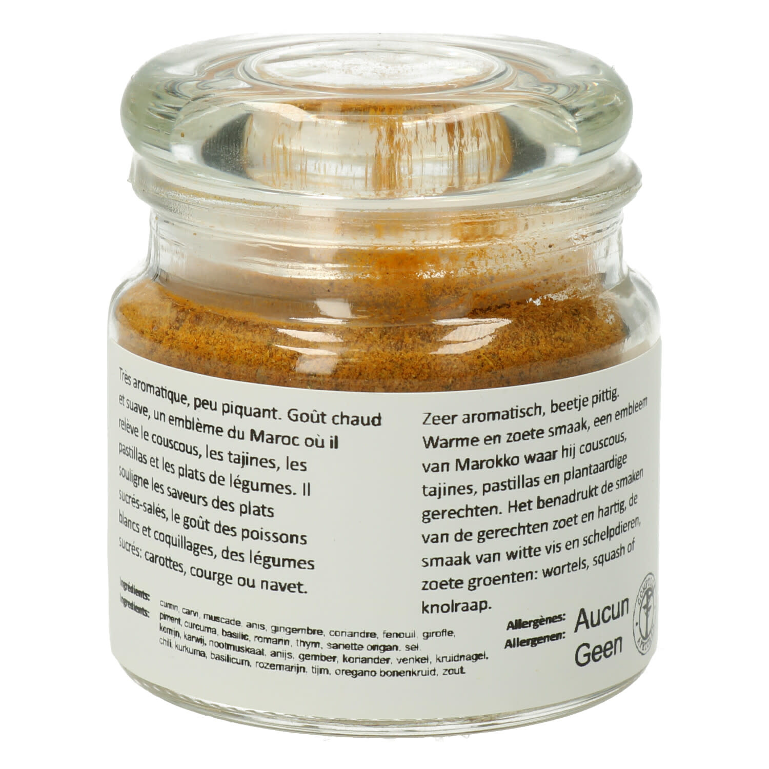 Ingrédients: cumin, carvi, muscade, anis, gingembre, coriandre, fenouil, girofle, piment, curcuma, basilic, romarin, thym, sariette origan, sel.