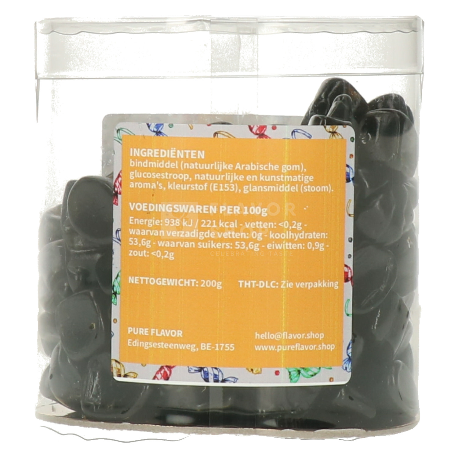 Ingrédients : liant (gomme arabique naturelle), sirop de glucose, arômes naturels et artificiels, colorant (E153), agent d'enrobage (vapeur d'eau).