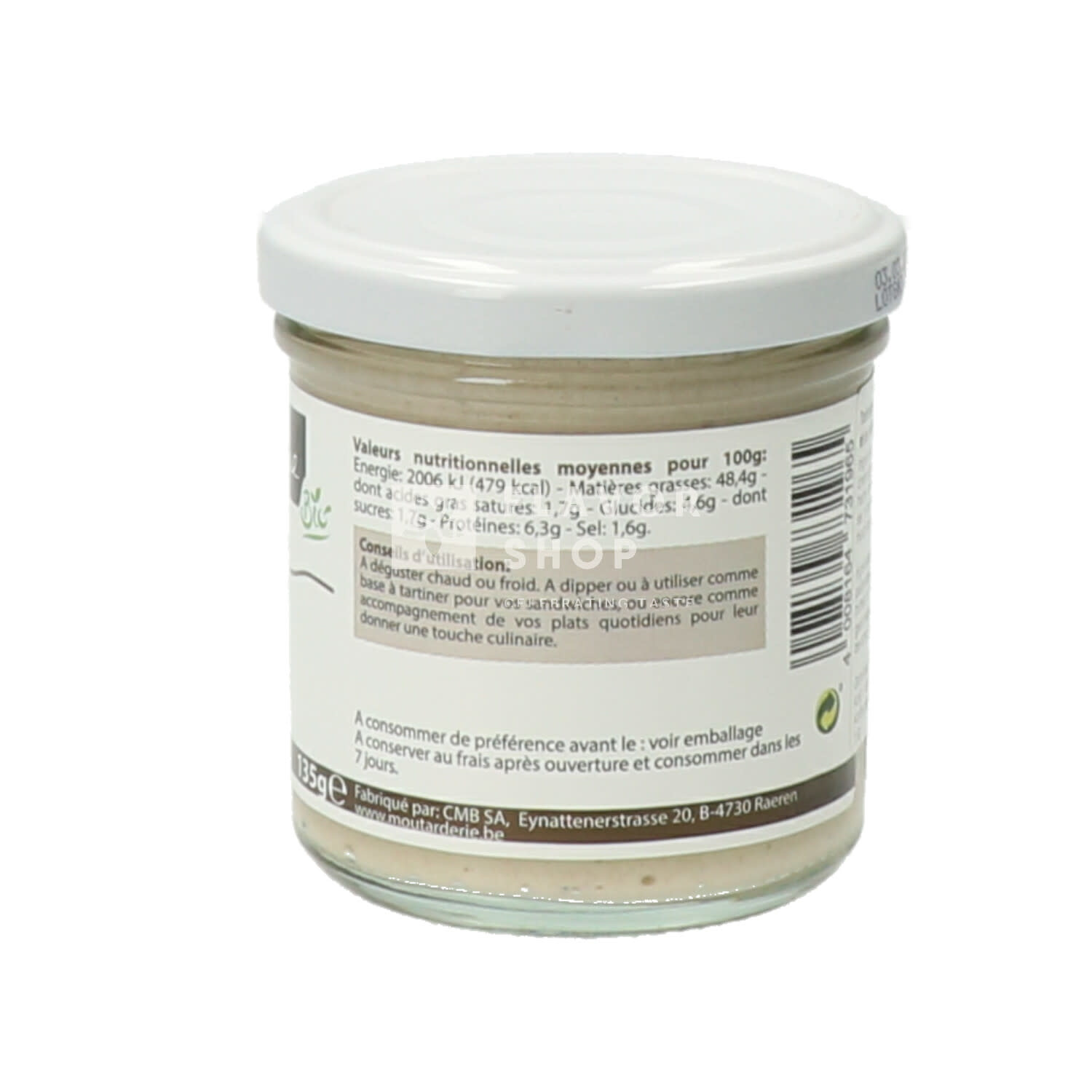 Ingrédients : Huile de colza*, graines de tournesol* 26%, eau, champignons*, vinaigre de cidre*, jus de citron*, sirop d'agave*, truffes hachées* 1,5% (truffe d'été 60%*, huile de tournesol*, sel), sel, huile de truffe aromatisée* 0,5%.