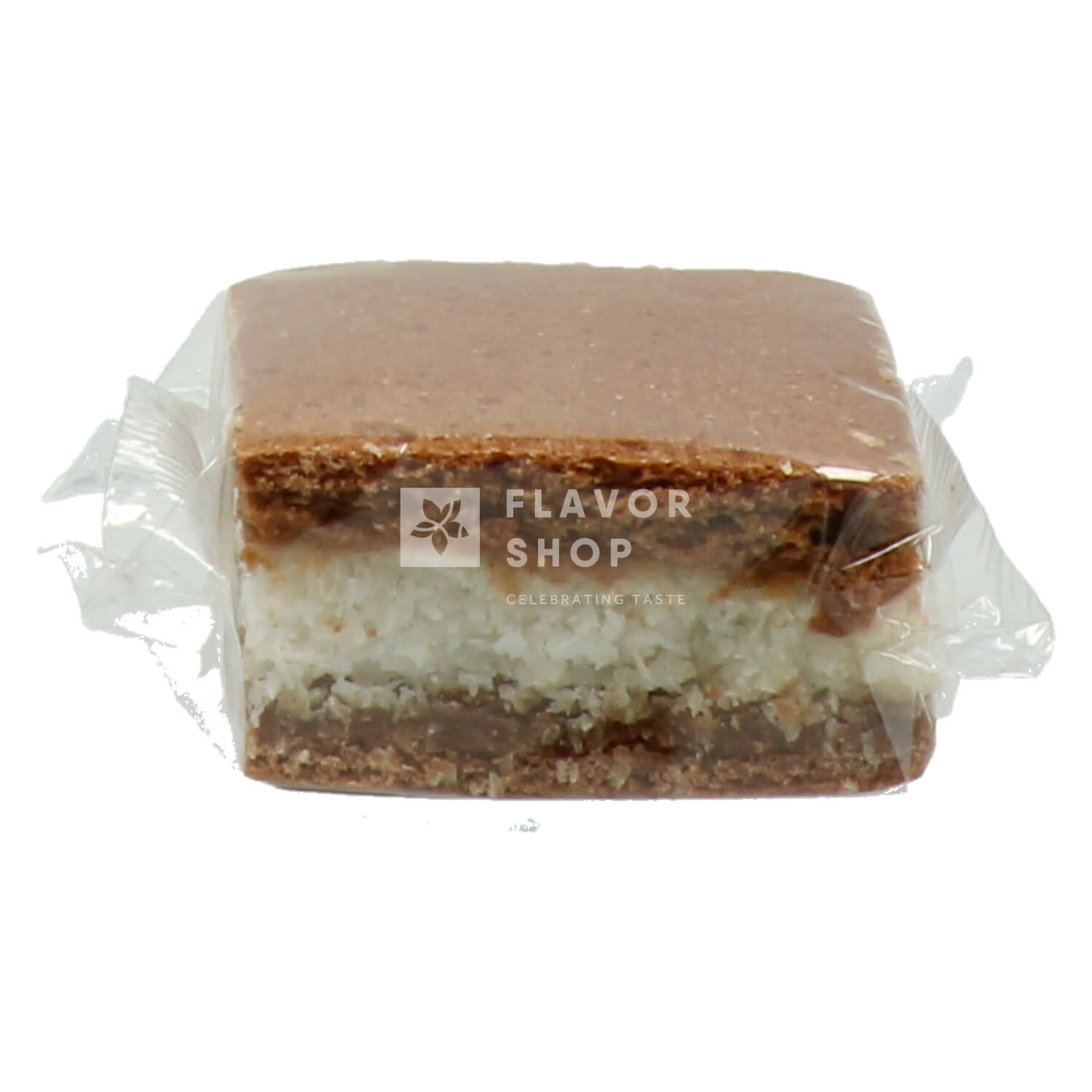 Biscuit [farine de BLé (GLUTEN), sucre candi, BEURRE (LAIT), LAIT en poudre, Å’UFS, MALT (GLUTEN), épices, levure chimique, sel, farine de soja (GLUTEN)] garniture [noix de coco r pée, sucre, édulcorant (sorbitol), poudre de PROTéINE, farine de BLé ( GLUTEN), E202, E270, sel]. Peut contenir des traces de fruits à coque.