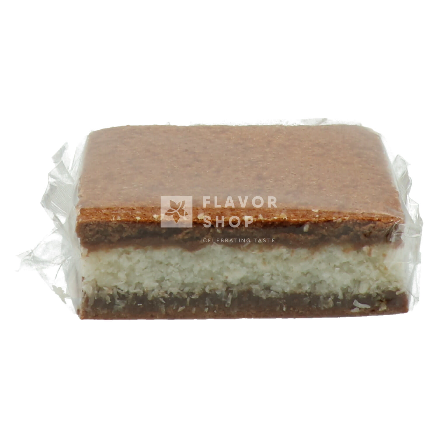 Biscuit [farine de BLé (GLUTEN), sucre candi, BEURRE (LAIT), LAIT en poudre, Å’UFS, MALT (GLUTEN), épices, levure chimique, sel, farine de soja (GLUTEN)] garniture [noix de coco r pée, sucre, édulcorant (sorbitol), poudre de PROTéINE, farine de BLé ( GLUTEN), E202, E270, sel]. Peut contenir des traces de fruits à coque.