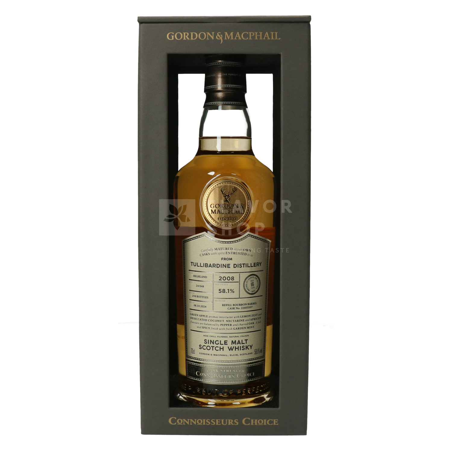 Le Gordon & MacPhail Tullibardine 2008 – 16 ans fait partie de la prestigieuse série Connoisseurs Choice de Gordon & MacPhail, un embouteilleur indépendant réputé pour ses sélections exceptionnelles de fûts. Ce single malt a été distillé en 2008 à la distillerie Tullibardine, située dans les Highlands écossaises, et a vieilli pendant 16 ans dans un fût de bourbon de second remplissage, ce qui lui confère un profil aromatique parfaitement équilibré.