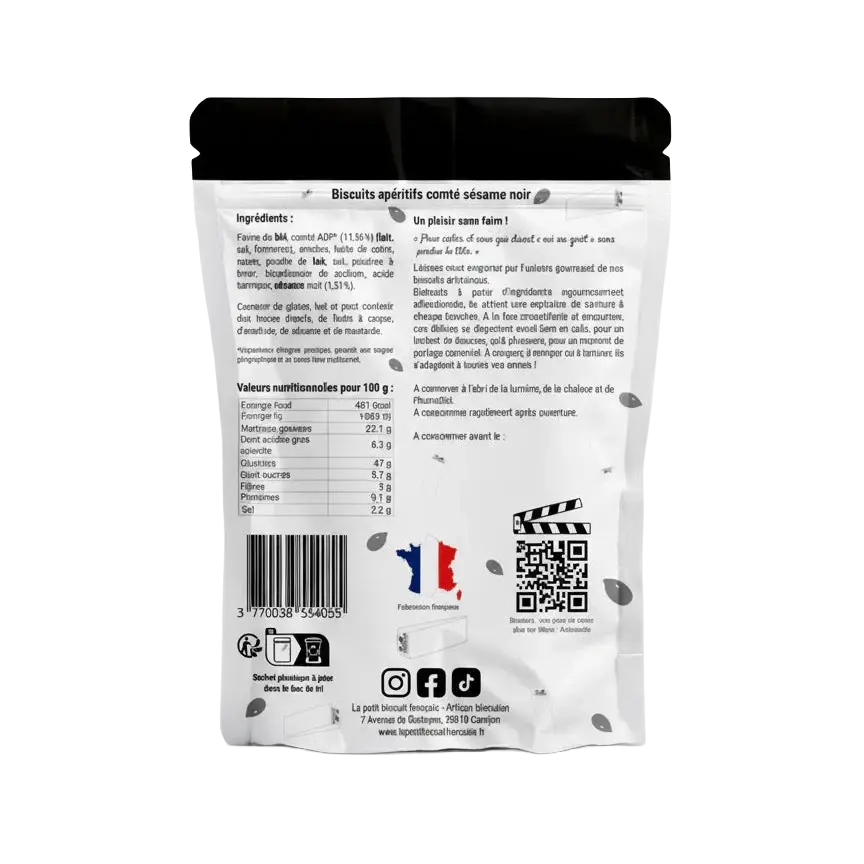 Een biscuit met koninklijke allure! De rijke smaak van Comté AOP en de verfijning van zwarte sesam komen samen in deze elegante Franse aperitiefkoekjes. Stijlvol, verrassend en onweerstaanbaar.