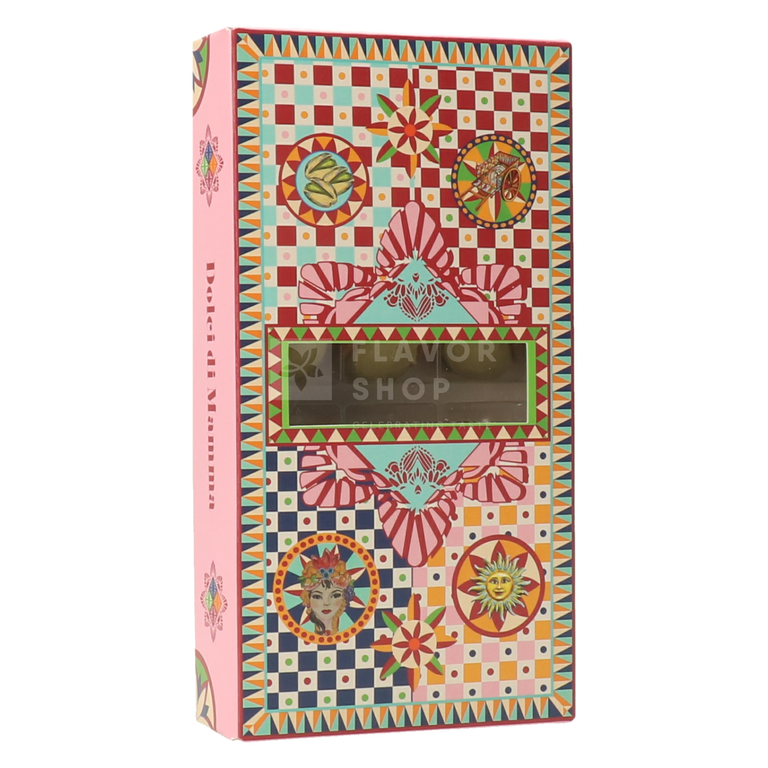 De cannoli zijn verpakt in een luxueuze, met folklore geïnspireerde doos die het ambacht en de Italiaanse feestcultuur perfect weerspiegelt. Ideaal om te serveren bij een kop espresso of als verfijnd dessert bij een etentje.