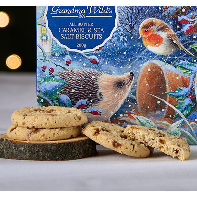 Binnenin vind je de onweerstaanbare All Butter Caramel & Sea Salt Biscuits. Deze koekjes combineren een boterachtige, knapperige crumble met stukjes zachte karamel en een vleugje zeezout. Het resultaat is een perfecte balans van zoet, romig en hartig, een luxueuze smaakervaring bij elke hap.