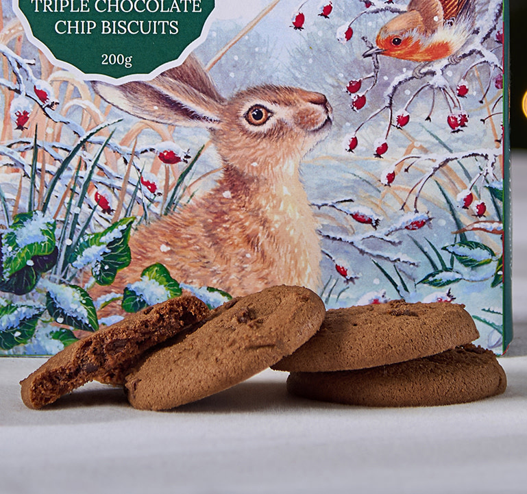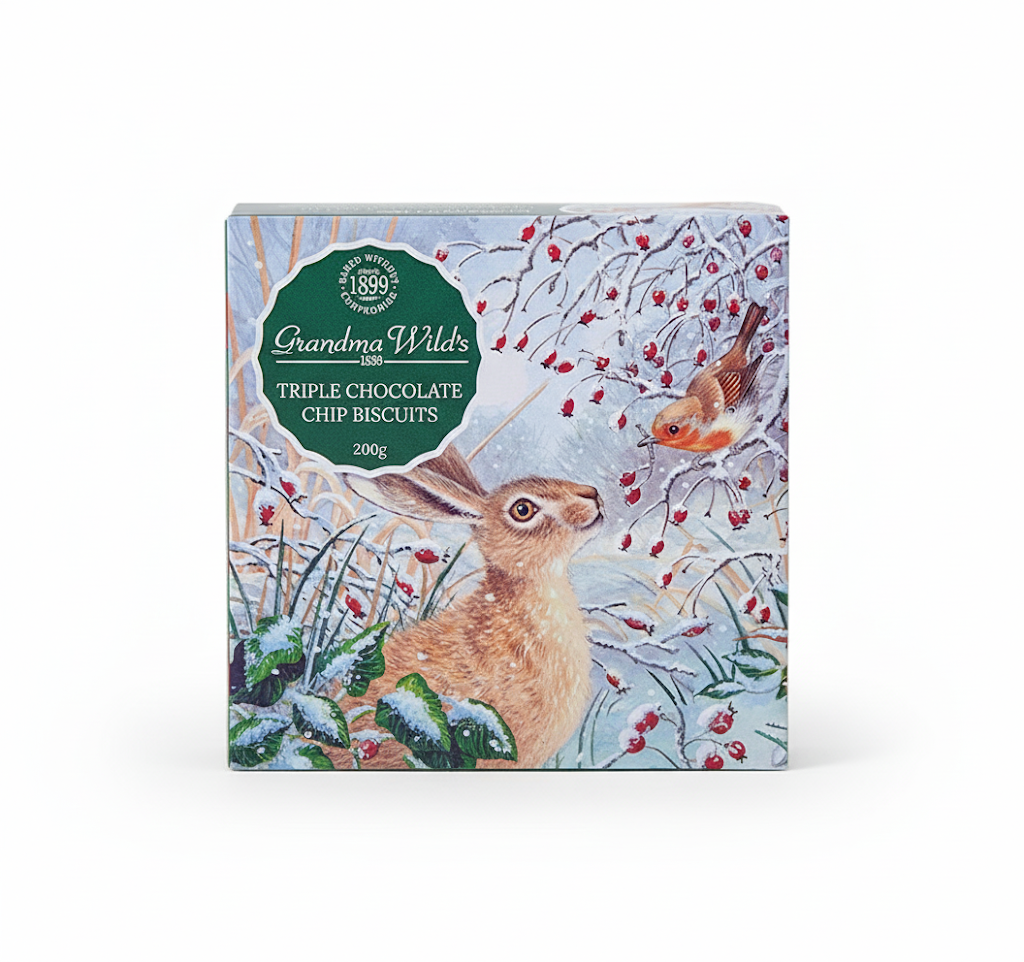De Hare & Robin Box van Grandma Wild’s is een feest voor het oog én de smaakpapillen. Het rijk geïllustreerde winterse tafereel met haas en roodborstje maakt deze doos tot een prachtig cadeautje voor de feestdagen. Binnenin ontdek je de onweerstaanbare Triple Chocolate Chip Biscuits, een perfecte mix van knapperigheid en romigheid.