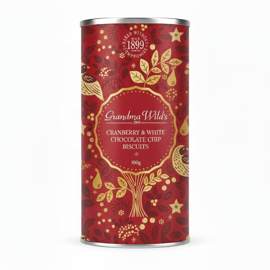 De Grandma Wild’s Cranberry & White Chocolate Chip Biscuits zijn een elegante traktatie voor liefhebbers van verfijnde smaken. Elke biscuit biedt een perfecte balans tussen de frisse, lichtzure smaak van veenbessen en de romige zoetheid van witte chocolade, verpakt in een charmant rood blik dat warmte en gezelligheid uitstraalt.