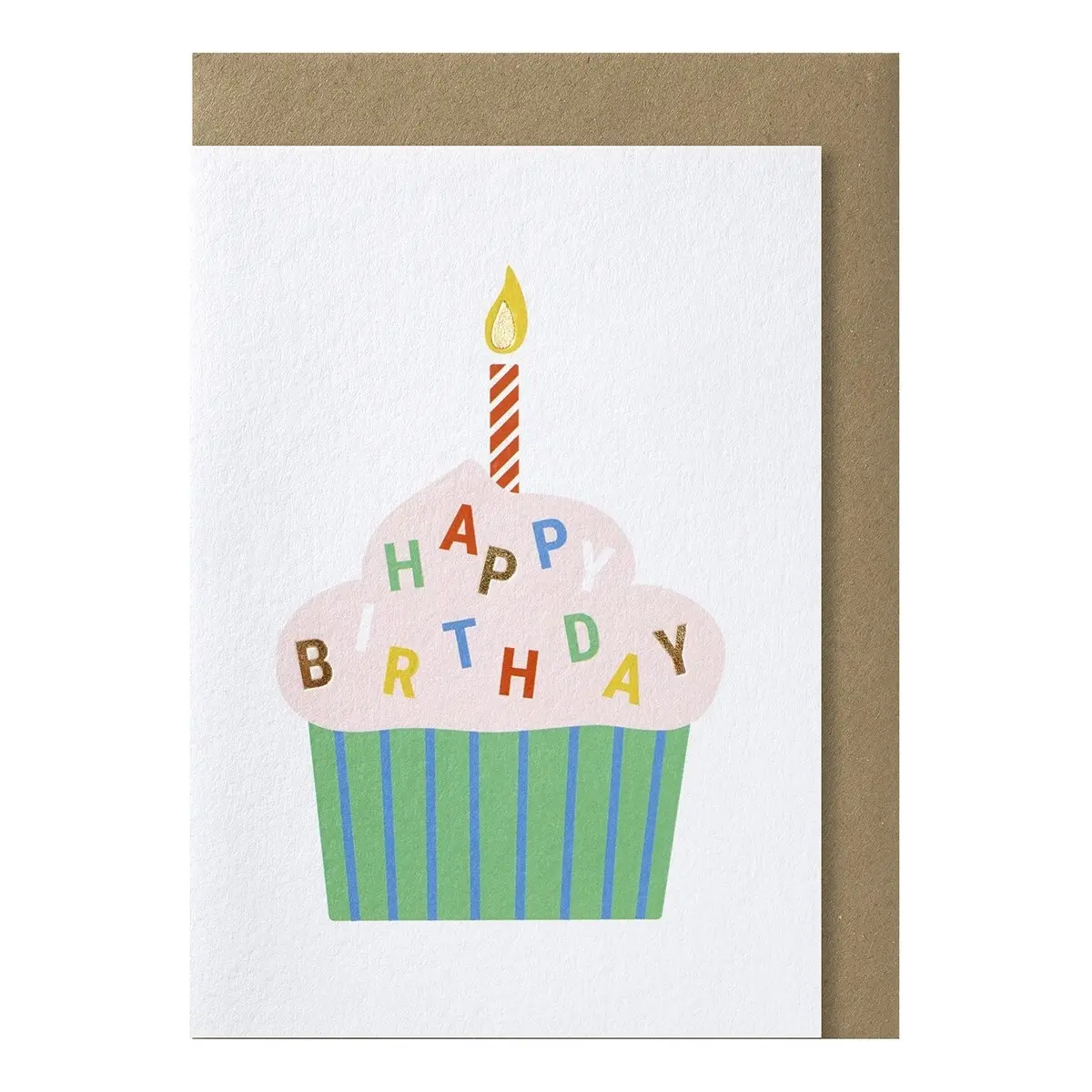 Deze vrolijke kaart toont een kleurrijke cupcake met roze topping, gestreept bakje en een knalrode verjaardagskaars. De letters van “Happy Birthday” dansen speels over de glazuurlaag heen – net als sprinkels! Een perfecte mix van zoet, speels en feestelijk.