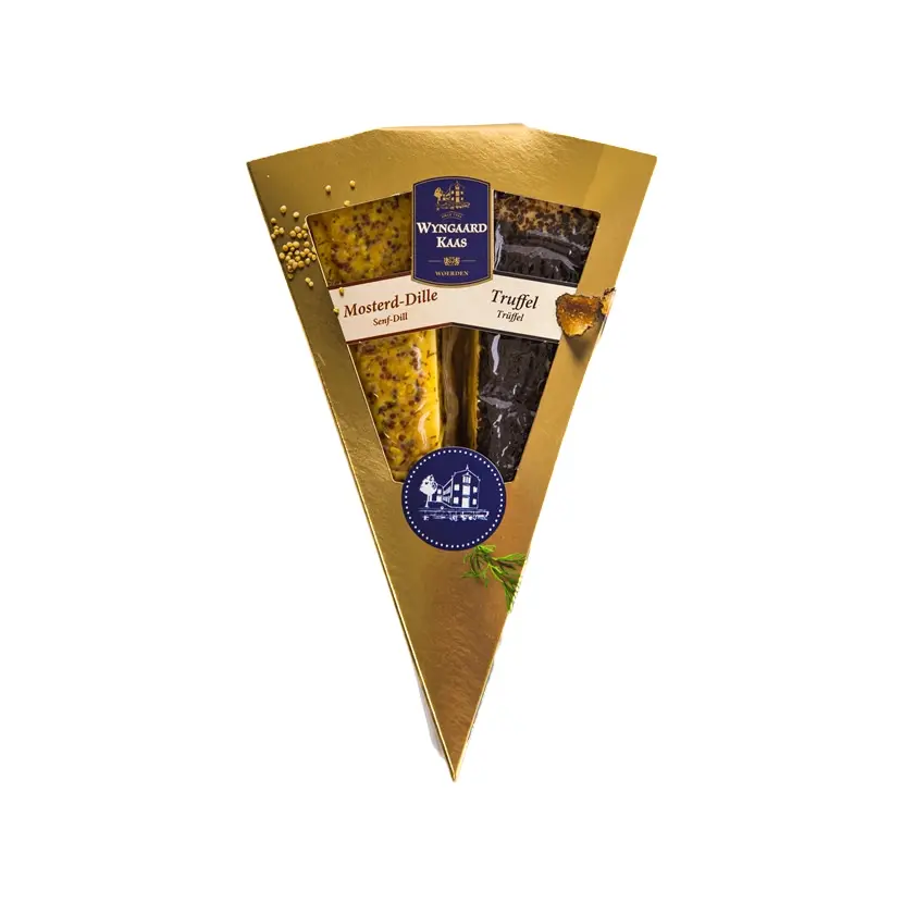 De Wijngaard Duo Kaaspuntjes Goud combineren het beste van twee werelden: een pittige mosterd-dille kaas en een verfijnde truffel kaas. Na een rijping van circa 16 weken worden deze kazen met zorg gesneden en ambachtelijk afgemaakt. De grove mosterd met frisse dille en de rijke truffeltapenade worden op de kaas gesmeerd, waardoor hun aroma’s diep in de kaas doordringen. Dit zorgt voor een intense, gelaagde smaakbeleving die zich na verloop van tijd verder ontwikkelt.