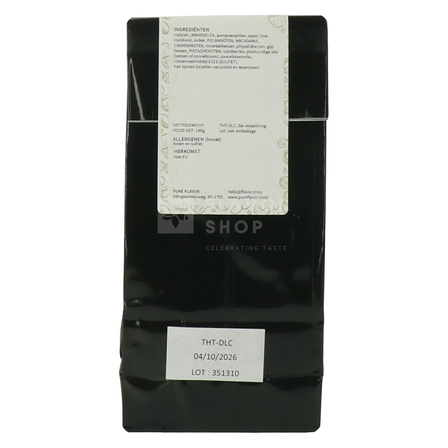 Ingrediënten: rozijnen, AMANDELEN, pompoenpitten, appel (low moisture), suiker, PECANNOTEN, MACADAMIA, CASHEWNOTEN, moerbeibessen, physalisbessen, goji bessen, PISTACHENOTEN, cranberries, plantaardige olie (katoen of zonnebloem), zonnebloemolie, conserveermiddel E223 (SULFIET).