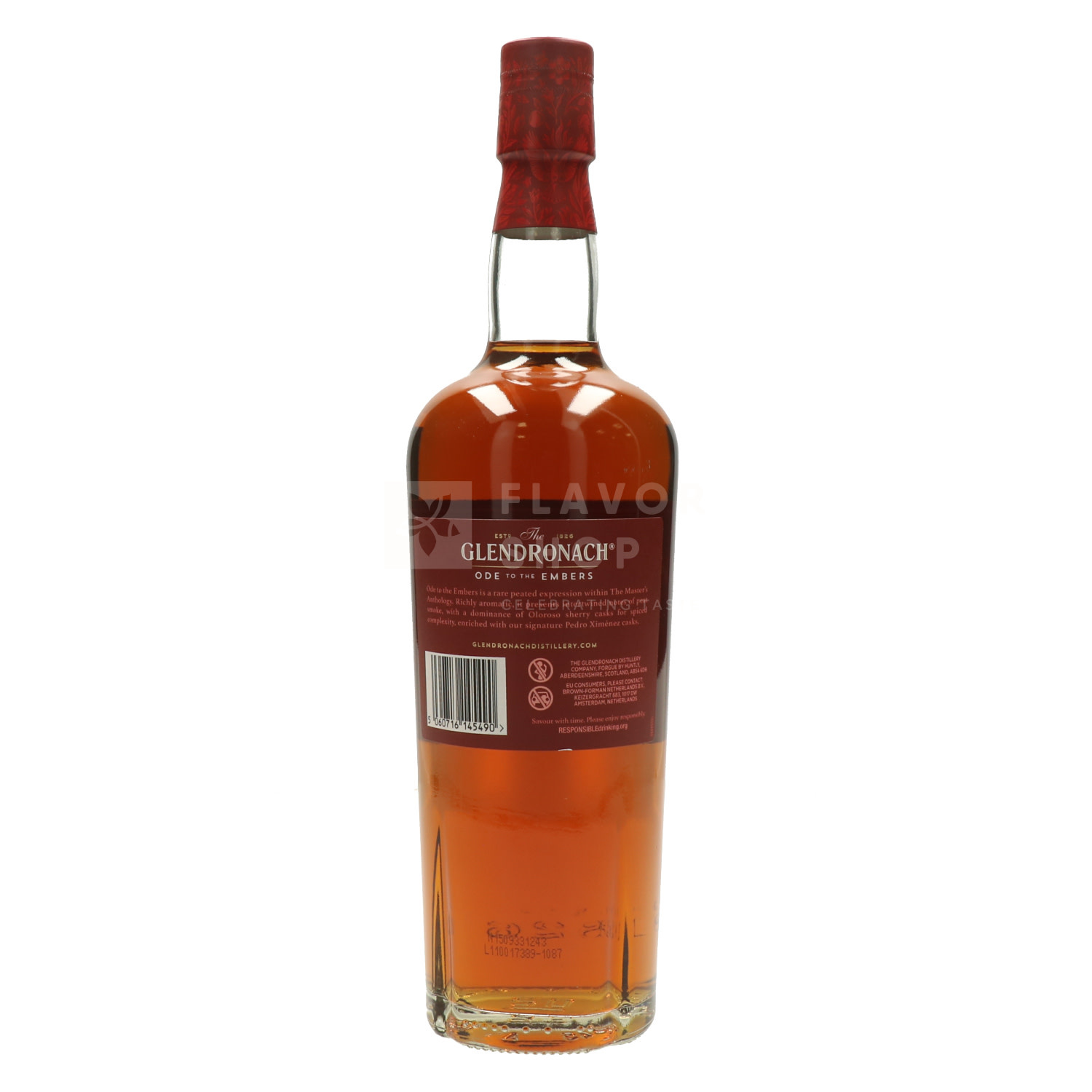 Deze aromatische single malt is doordrenkt met verweven tonen van turfrook, kruidige diepgang uit Oloroso sherryvaten, en een rijke afronding met GlenDronach’s kenmerkende Pedro Ximénez-vaten.