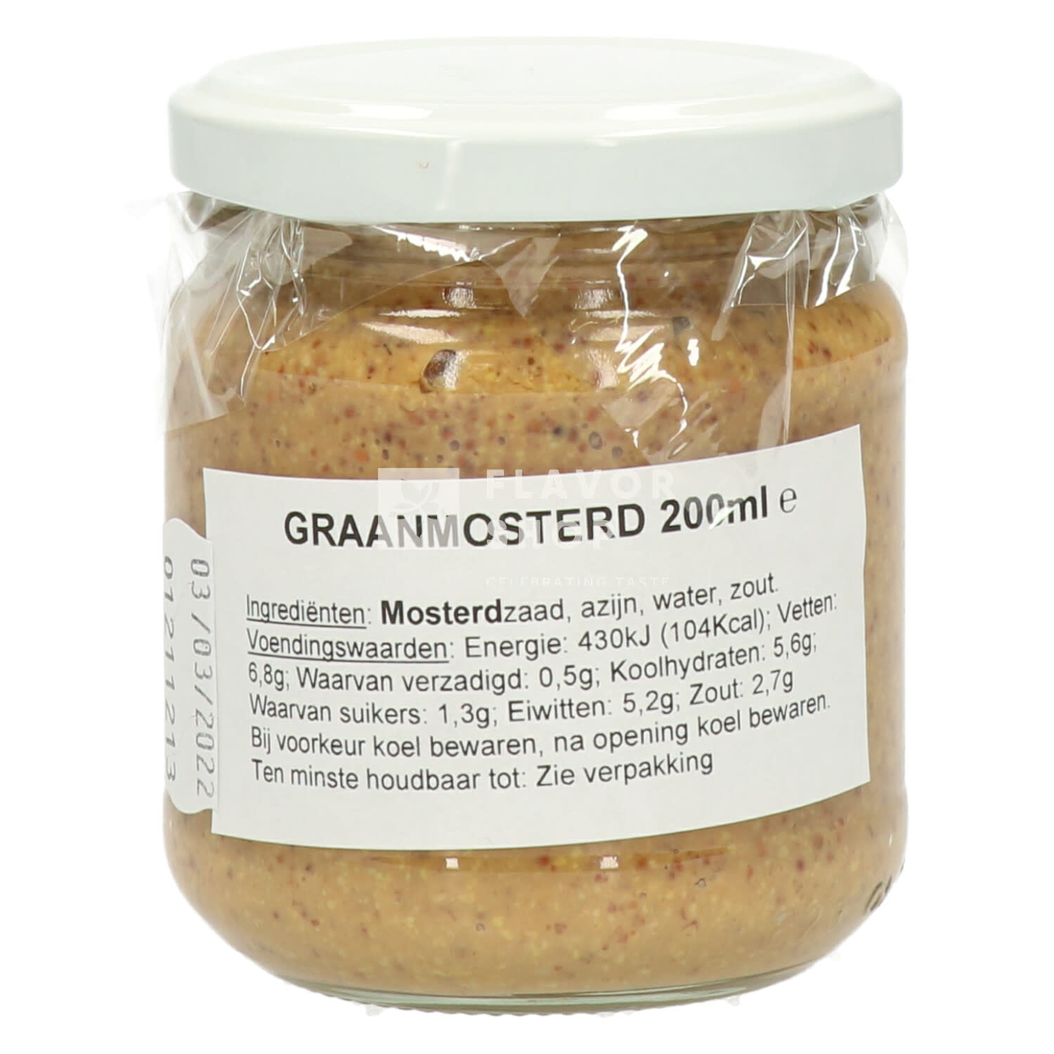Variant op de gekende Tierenteyn-Verlent mosterd. Door het toevoegen van hele mosterdzaadjes zorgt voor een grove textuur, maar met dezelfde scherpe smaak. Zeer lekker in dressings, stoemp en stamppot!