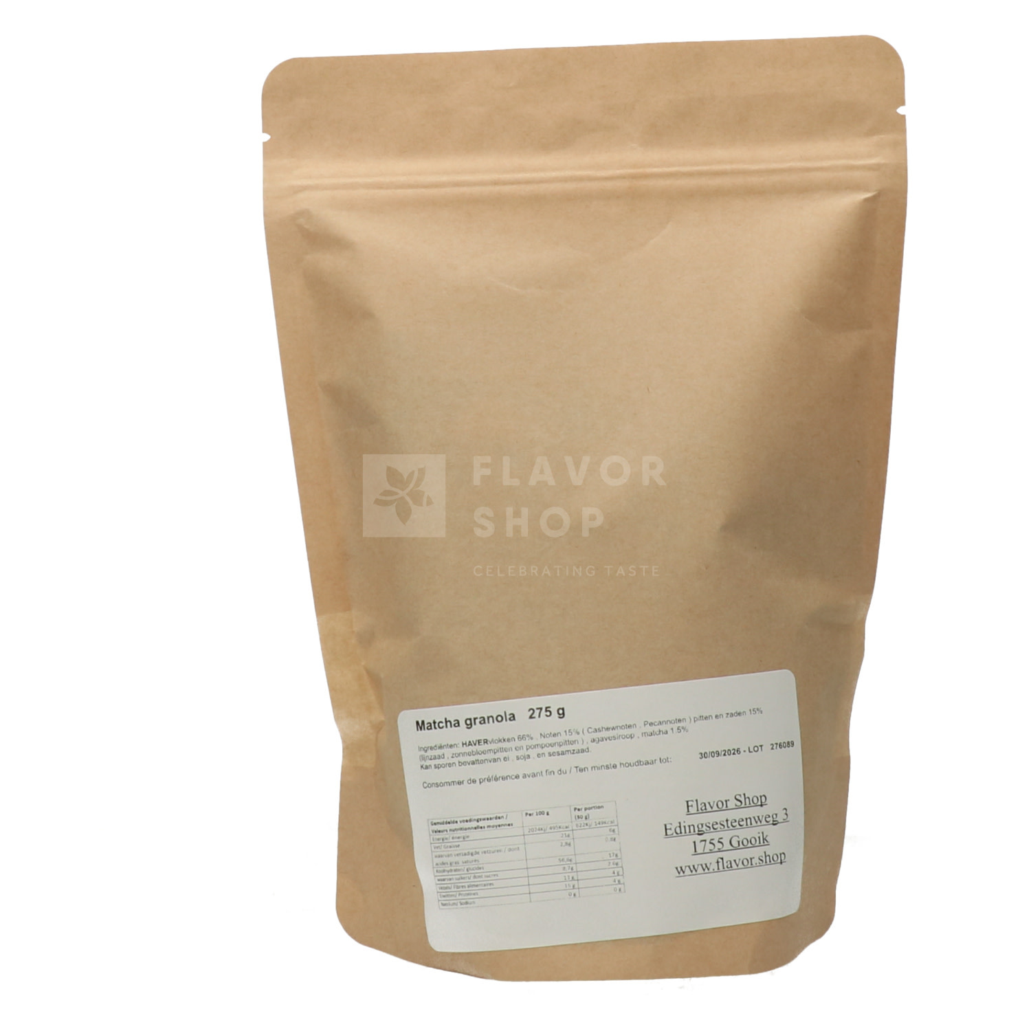 Ingrediënten: HAVERvlokken, CashewNOTEN, PecanNOTEN, Lijnzaad, Zonnebloempitten, pompoenpitten, Agavesiroop, Matcha 1,5%.