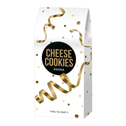 De stijlvolle feestverpakking in wit met goud en sierlint-design maakt deze kaassnack ideaal voor kerstpakketten, aperoboxen en eindejaarsgeschenken.
