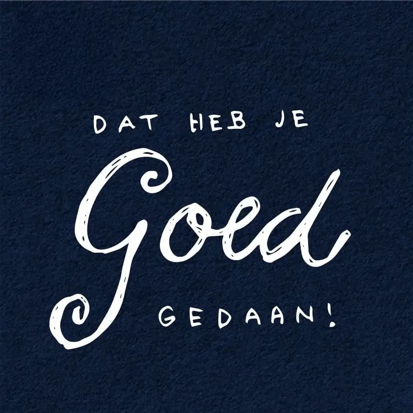 “Dat heb je goed gedaan!”, een eenvoudige boodschap met grote betekenis. Of het nu gaat om een behaalde mijlpaal, een moeilijke stap die is gezet of gewoon een moment waarop iemand iets fantastisch heeft gedaan, dit kaartje is dé manier om dat te vieren. De diepe nachtblauwe achtergrond gecombineerd met sierlijke en speelse typografie maakt het stijlvol én vrolijk tegelijk. Perfect voor collega’s, vrienden, kinderen of iedereen die wel wat erkenning verdient.